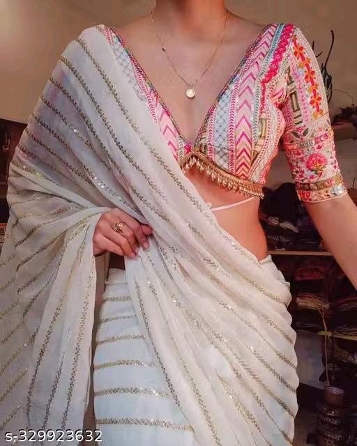 Georgette Embroidered Elegant White Color Sreee With Blouse || Saree For Women || Trending Saree For Women || Bollywood Stylish Fancy Party Wear Wedding Festive Bridal Sari